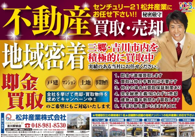 【三郷市・吉川市】不動産売却でお悩みの方へ。センチュリー21松井産業が「即金買取」で解決します!