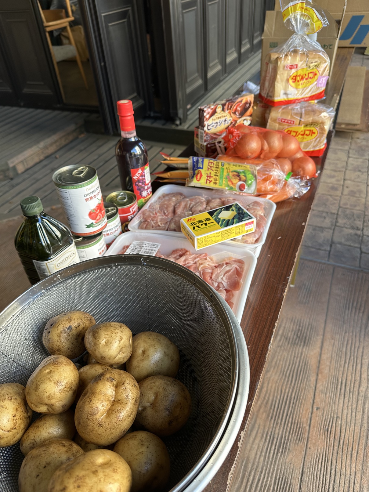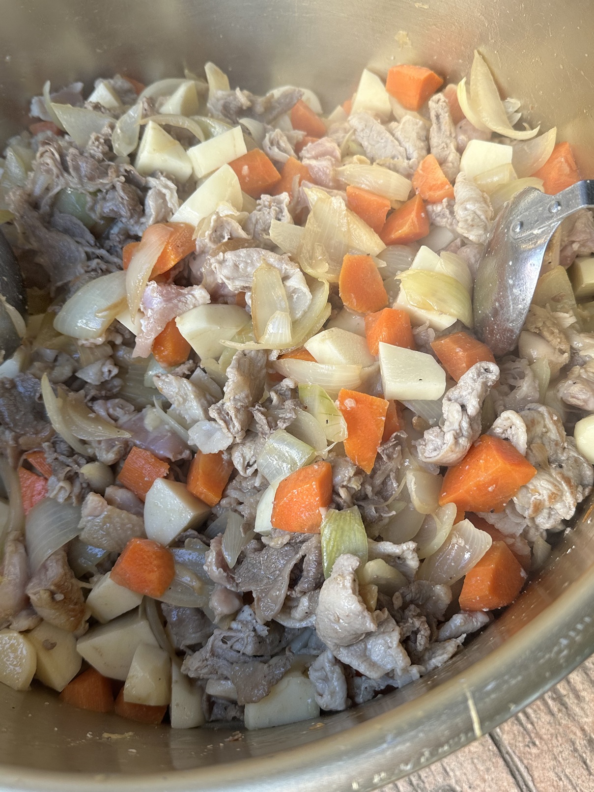 山盛りのジャガイモ、ニンジン、タマネギ、そしてたっぷりのお肉!美味しいシチューを作るぞ!という気合が伝わってきますね。