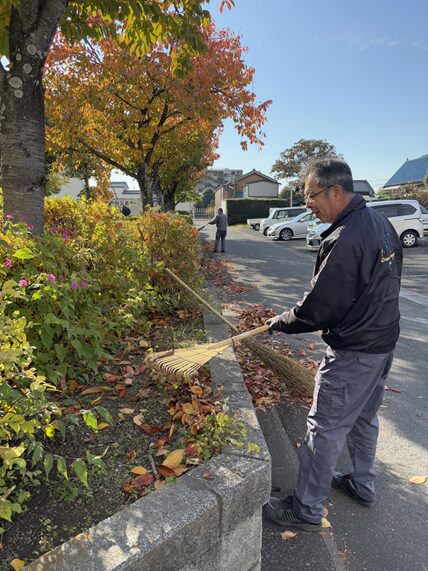 秋が深まり、公園は色鮮やかな落ち葉でいっぱいになります。町会の皆様と共に竹ぼうきや熊手を手に取り、歩道や植え込みを丁寧にはいていきます。