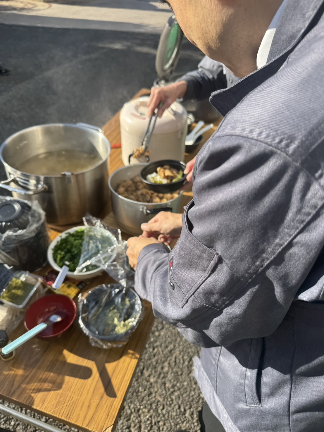 出来立てを受け取ったら、みんなで青空の下へ。 寒い中で食べる熱々のご飯は、高級レストランにも負けない美味しさです。