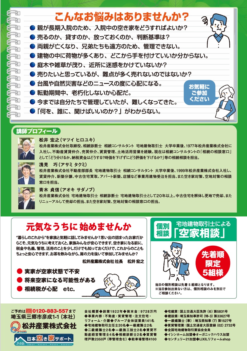 そんな風に、心のどこかで気掛かりになっていることはありませんか? 松井産業では、皆さまの不安を安心に変えるための「住まいの終活・空き家対策セミナー」を定期開催しています!