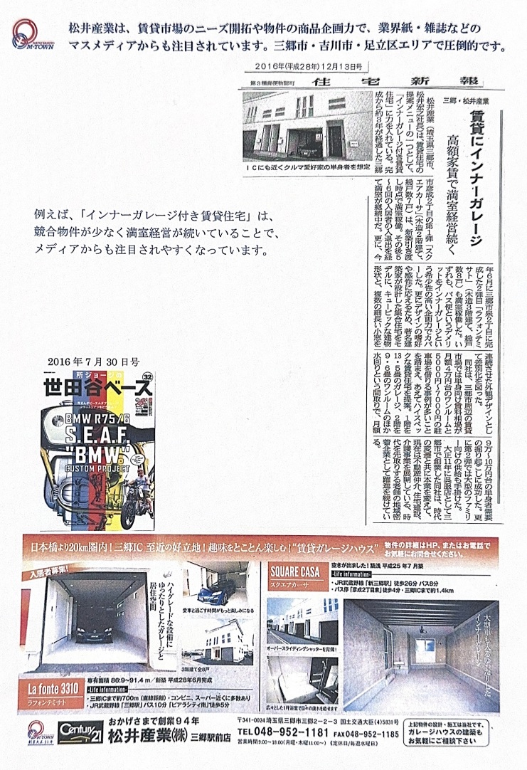 10年前、三郷インター周辺の立地優位性に着目し、私たちが提唱したのは「愛車と共に暮らす」という新しい賃貸の形でした。 専門誌『ガレージライフ』に2年連続で掲載された「ラフォンテミサト」は、当時主流だった画一的なアパート経営とは一線を画し、空室待ちが絶えないほどのブランド力を築きました。競合の少ないニッチな層を狙い撃つことで、長期的な収益安定を実現する。この「商品企画力」こそが、松井産業の賃貸管理の真髄です。
