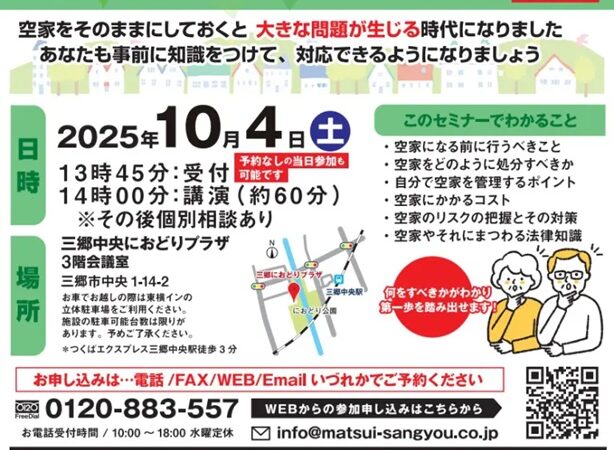 【埼玉県三郷市】10月4日土曜日本日開催 大切なお住まいの「終活」考えてみませんか?無料セミナー開催