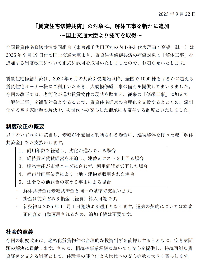 【賃貸オーナー様向け】「賃貸住宅修繕共済」の補償対象に「解体工事」が追加されました。