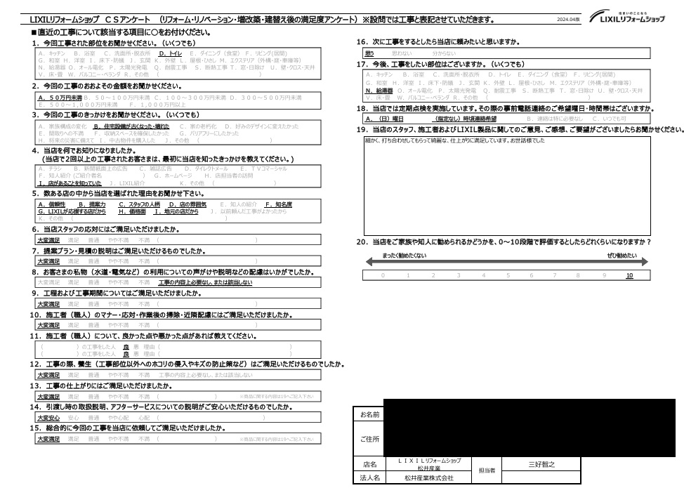 【埼玉県三郷市】O様邸トイレ改修工事アンケートをいただきました。